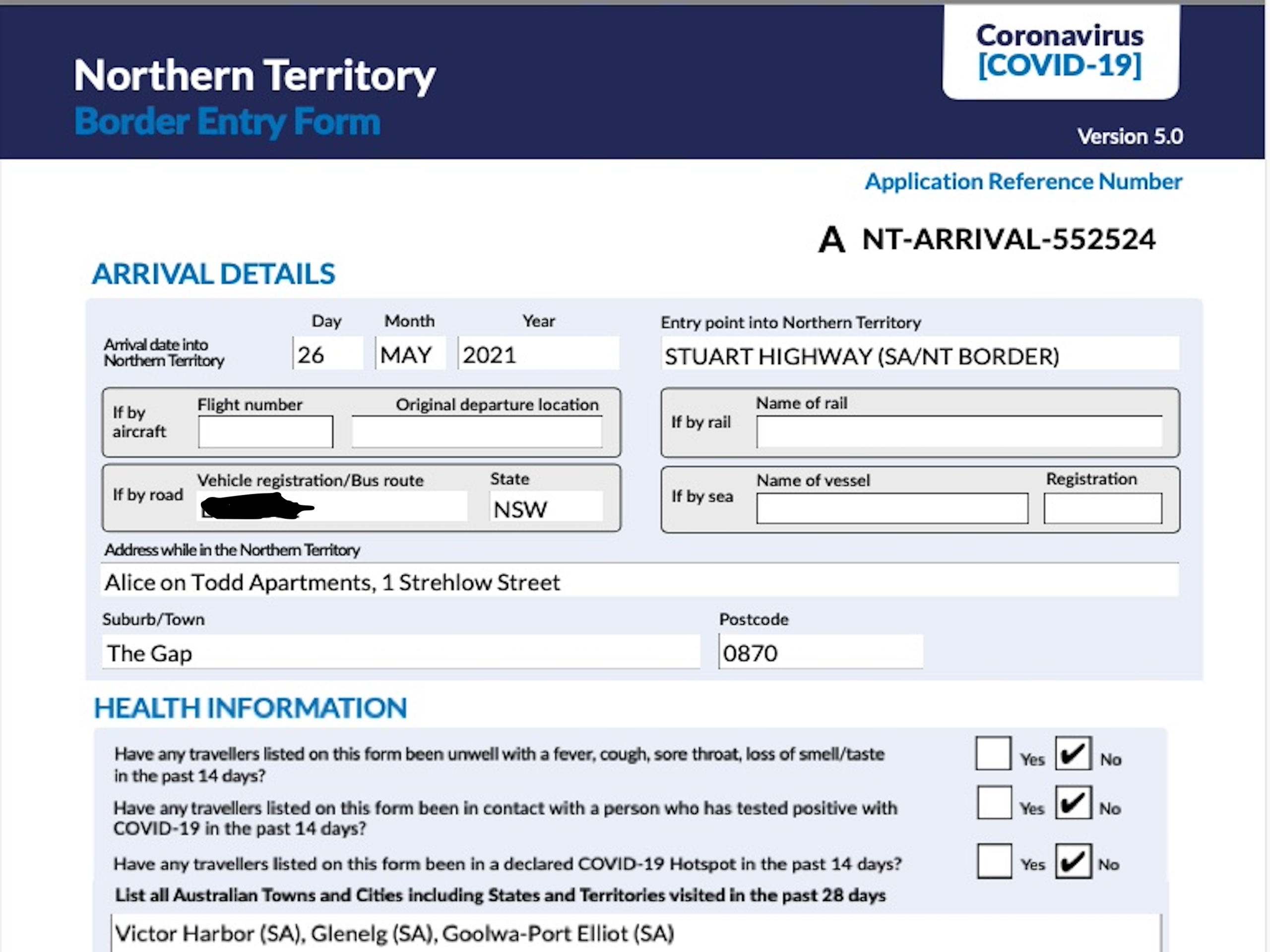 Because of COVID-19 restrictions we had to complete an application form in advance for a cross-border permit to enter the currently COVID-19 free Northern Territory – listing all the places that we had been in the last 28 days. If any cases of COVID-19 had occurred in one of these locations then we would be stopped at the border and not allowed to enter the Northern Territory. Because South Australia was also COVID-19 free at this point, we would have to have been very unlucky to get stopped, as it would mean that COVID-19 had gotten into South Australia from another state during our two day drive to Alice Springs.